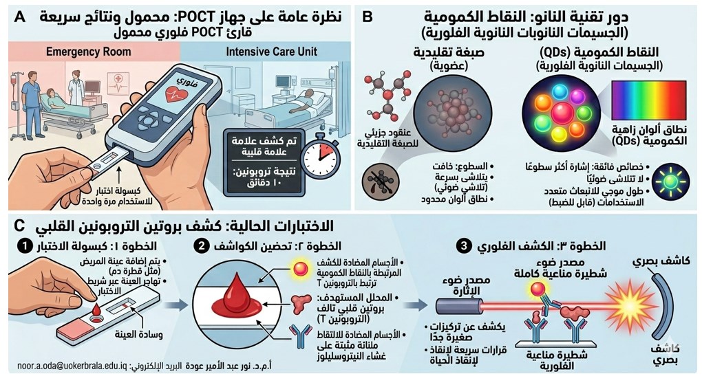 الشكل 3: نظرة عامة تخطيطية لأجهزة الفحص الفلوري نقطة الرعاية (POCT). يوضح المخطط تفوق النقاط الكمومية (QDs) على الصبغات العضوية التقليدية من حيث سطوع الإشارة واستقرارها، بالإضافة إلى آلية الكشف السريع عن بروتين التروبونين القلبي في حالات الطوارئ.