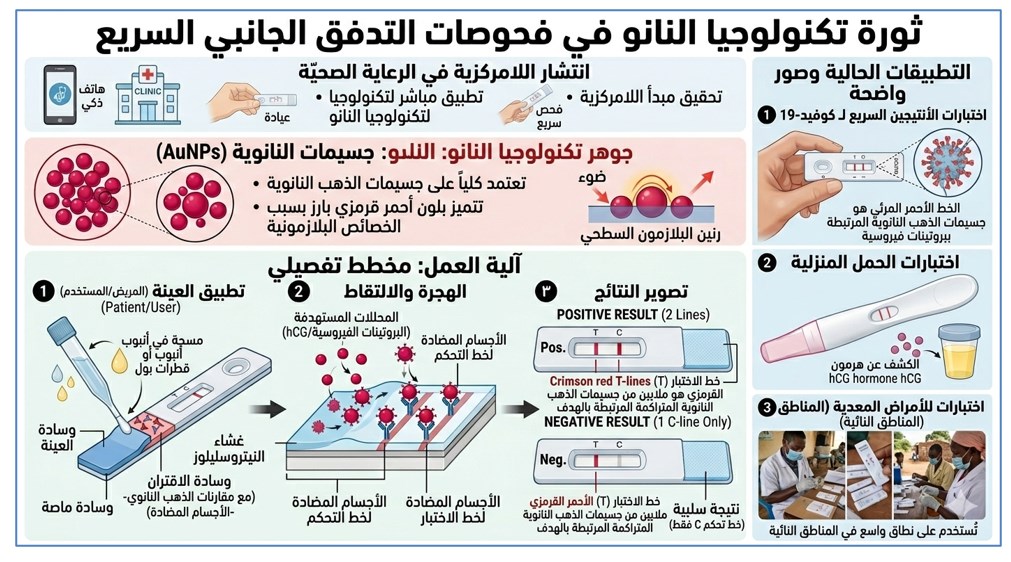 - العدالة الصحية: اختبارات التدفق الجانبي المدعومة بالنانو توفر تشخيصاً دقيقاً ورخيصاً لا يحتاج إلى ثلاجات أو طاقة كهربائية، مما يجعل التشخيص المتقدم متاحاً للدول النامية والمناطق النائية.[14]