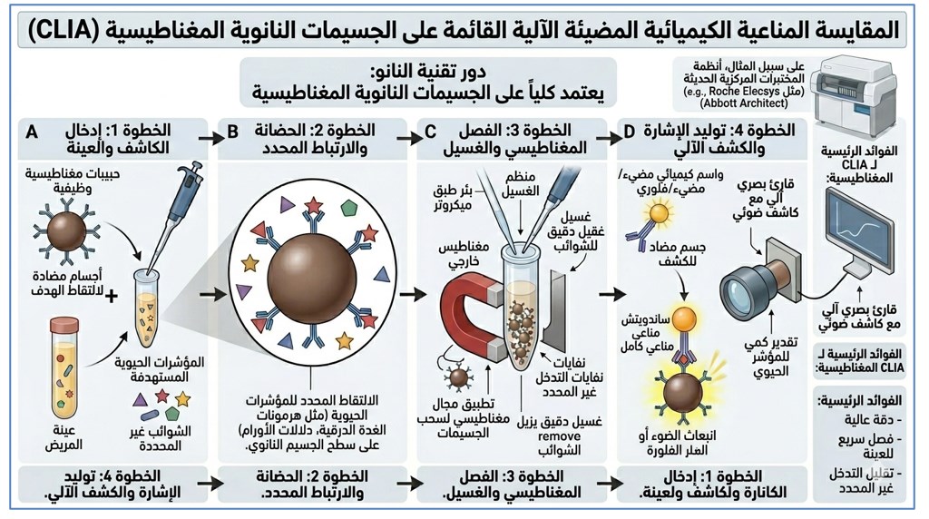 الشرح التوضيحي: يوضح المخطط الخطوات الأربع الرئيسية لعملية (CLIA) المُستخدمة في أنظمة المختبرات المركزية الحديثة (مثل Roche Elecsys و Abbott Architectالخطوة 1: إضافة الجسيمات النانوية المغناطيسية (المطلية بأجسام مضادة لالتقاط الهدف) إلى عينة دم المريض.الخطوة 2: الارتباط المحدد للمؤشرات الحيوية المستهدفة (مثل هرمونات الغدة الدرقية أو دلالات الأورام) بالأجسام المضادة خلال فترة الحضانة. الخطوة 3: تسليط مجال مغناطيسي خارجي لجذب وعزل معقدات (الجسيمات النانوية-المستضد)، مما يسمح بغسل العينة بدقة وإزالة الشوائب غير المحددة بالكامل. الخطوة 4: إضافة واسم كيميائي مضيء أو فلوري لتوليد إشارة ضوئية، يتم قياسها كمياً بعد ذلك بواسطة قارئ بصري آلي. تضمن هذه التقنية المعتمدة على تقنية النانو دقة عالية، وسرعة في فصل العينات، وتقليلاً كبيراً للتداخلات غير المحددة.